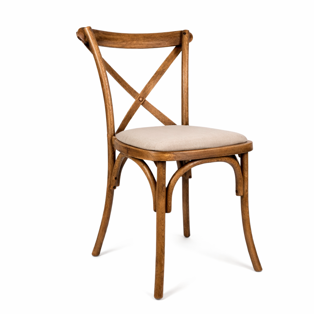 A favorite for barn weddings, vineyard ceremonies, and vintage-inspired receptions. These wooden cross back chairs bring warmth, charm, and a timeless aesthetic to any event.